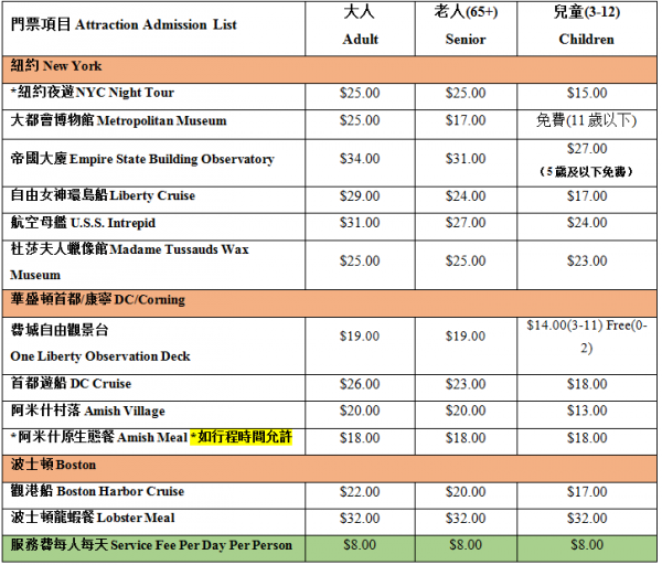 3. 新增唐人街上车点,波士顿参团客人需提供上车时间(9am —10pm之间),我司将安排免费接驳。上车地址:88 Beach St, Boston, MA 02111